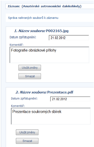 Soubory jsou spravovány automaticky v systému souborů serveru pomocí generovaných jmen. Vazba na původní jméno souboru a na záznam je v metadatech. Ty je možné vyexportovat ve formátu xml.
