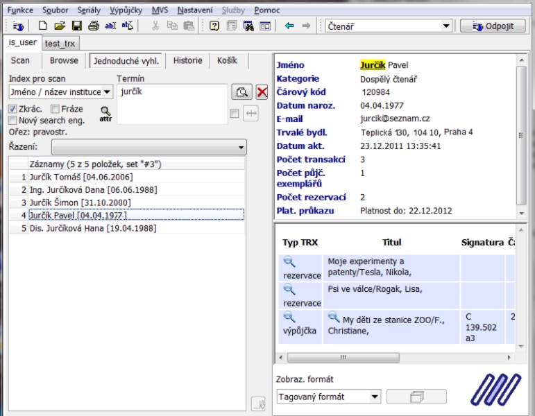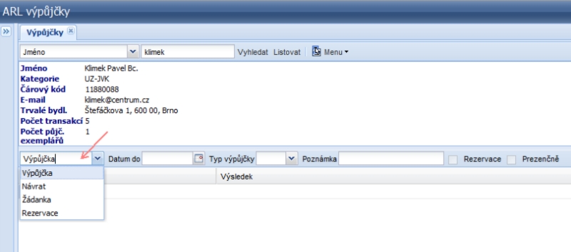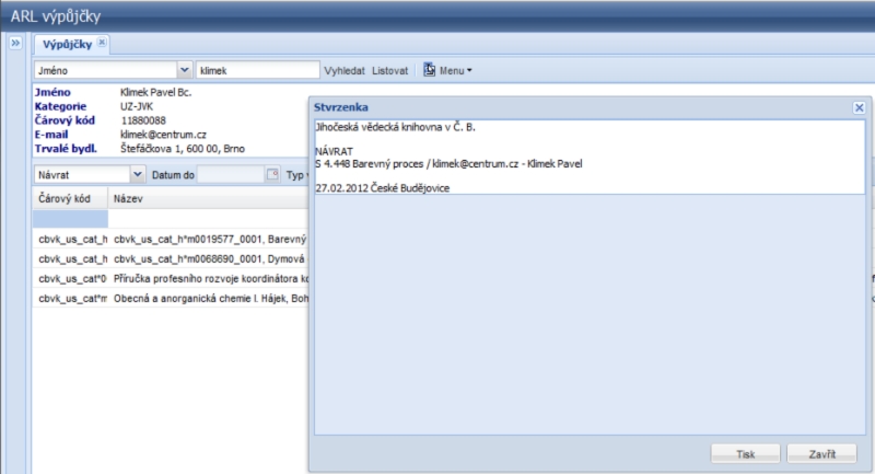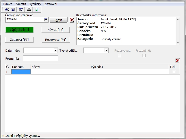 - outputs according to the reader or the time interval, the possibility of the lending module to work off-line in the event of loss of communication with the server, support for dislocations with the so-called „free selection“ for which special arrangement of loans is in place: the basic option is to search for books on open shelves by readers who bring them up to the counter to a librarian, the other possibility is remote ordering through requests from IPAC,